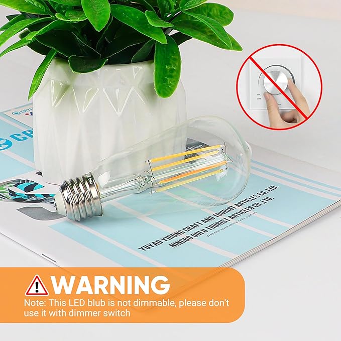 - High CRI 85+ and super brightness: Our e26 Filament bulbs have a maximum CRI 85+, which is better than 99% bulbs on the market. They can vividly realize the true color in life and enrich your visual experience. When the lights turn on, the led bulbs will be at full brightness with super bright 900lumen and 2700K Yelloe warm white light, emitting 360-degree lighting without dead ends.
