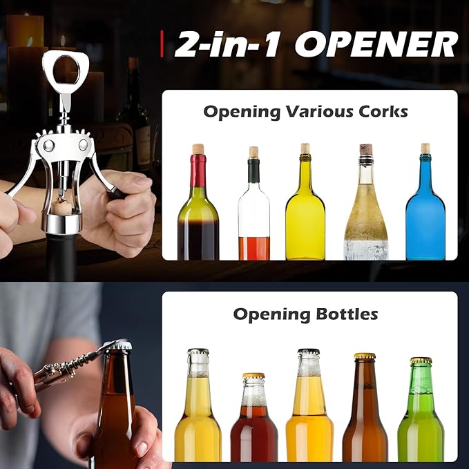 - ✔【All-In-One Design】- The multifunctional corkscrew wine opener built-in bottle opener is designed for wine beer and other bottles with caps or corks meet all your needs.