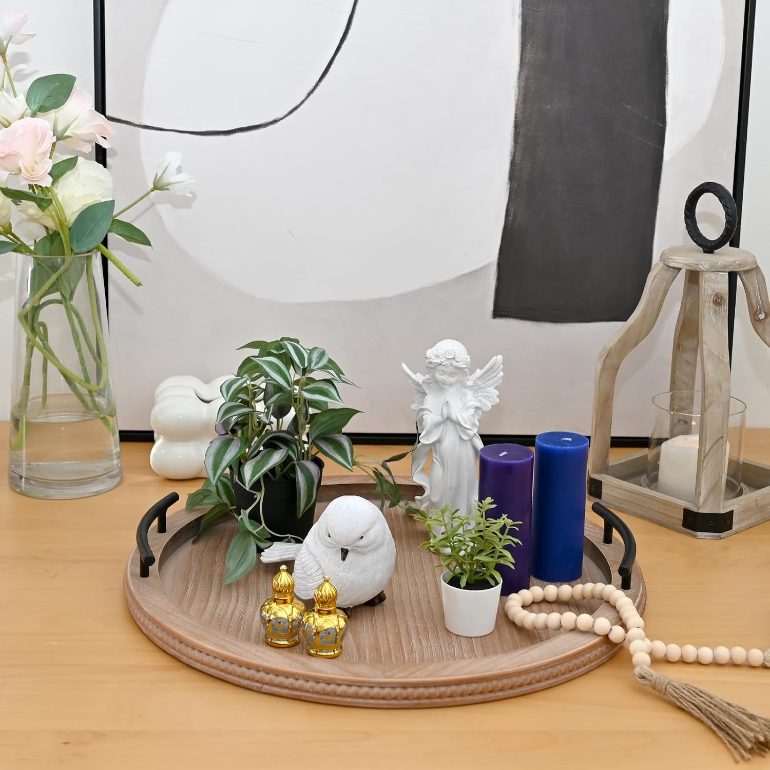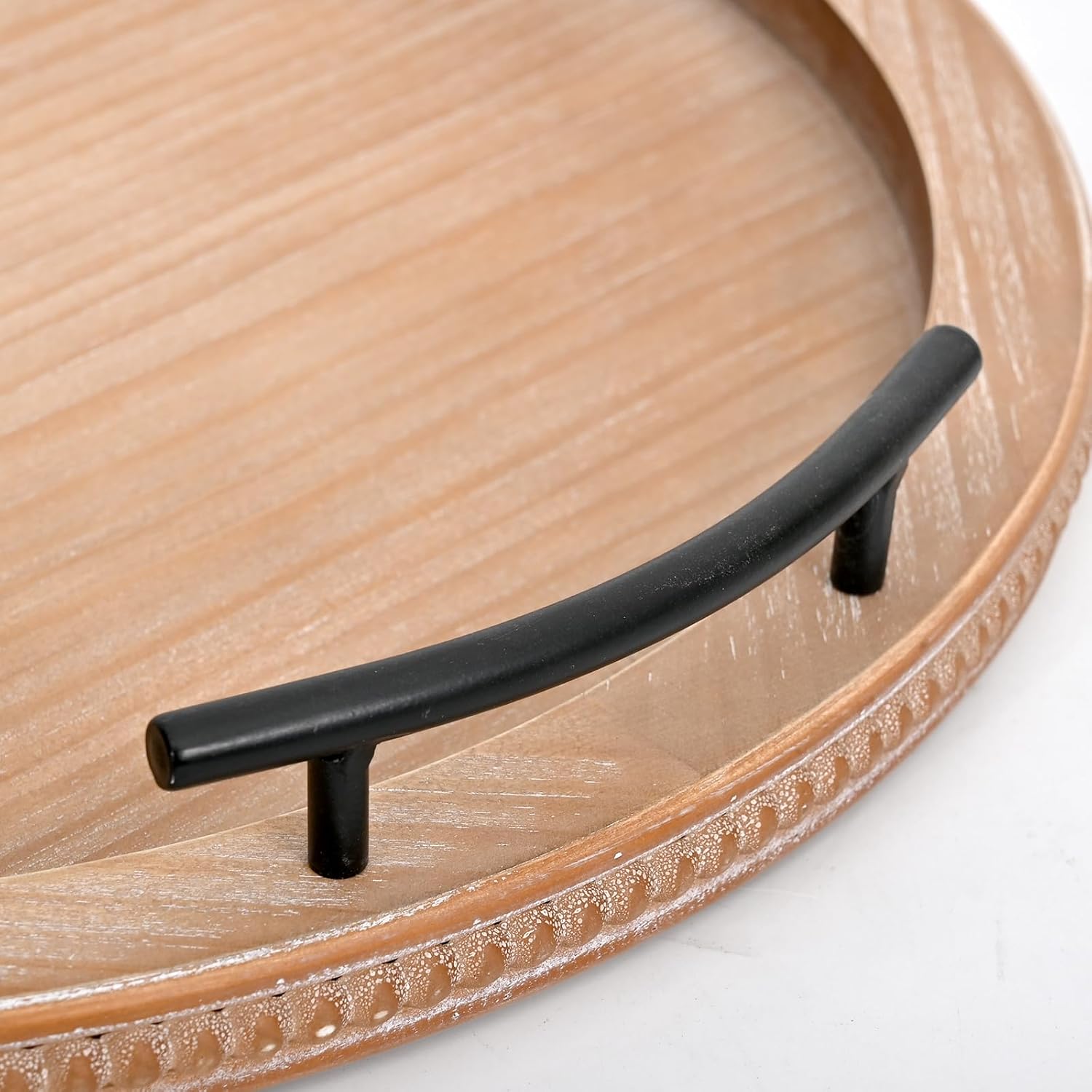 - ELEGANT ROUND DECORATIVE TRAY: Invite guests into your space with our stylish circular tray! This home decor accessory is adorned with unique wooden beads and features two robust metal handles for effortless handling.
