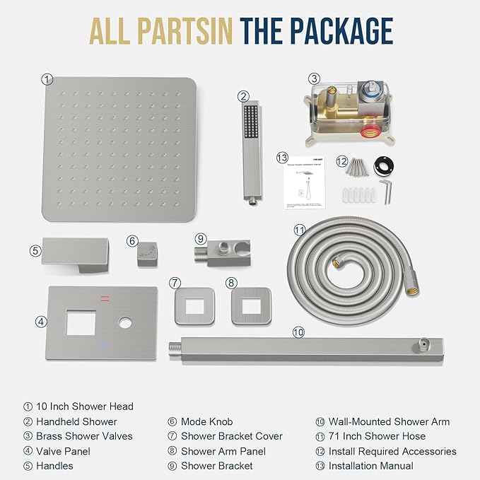 - 【Includes】: 10 inch rain shower head, handheld shower head, 71 inch shower hose, 16 inch shower arm, handheld bracket, mixing valve, panel, handle, mode knob, Shower arm cover, handheld bracket cover and installation accessories