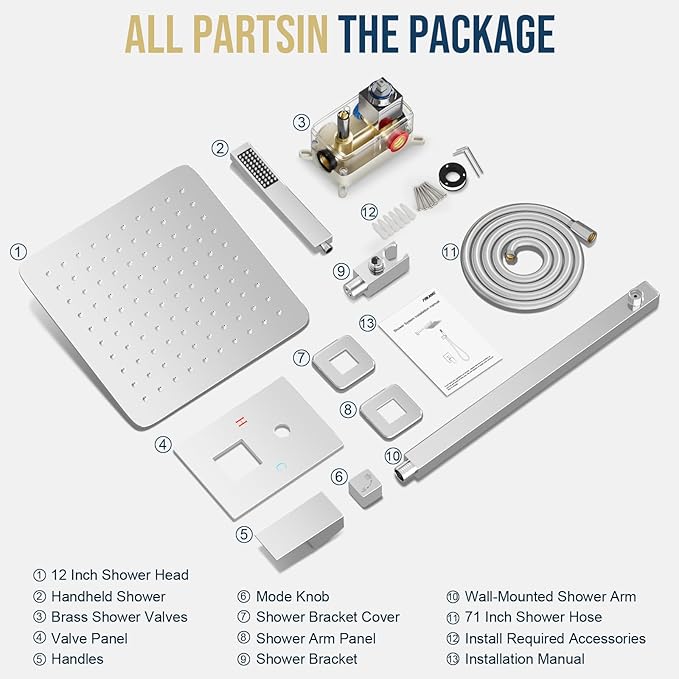 - 【Includes】: 10 inch rain shower head, handheld shower head, 71 inch shower hose, 16 inch shower arm, handheld bracket, mixing valve, panel, handle, mode knob, Shower arm cover, handheld bracket cover and installation accessories