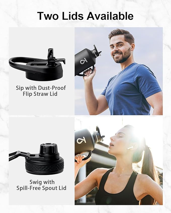 - A Handle You Can Rely On: Engineered with an integrated and ergonomic handle, Trebo 64 oz insulated water bottle is super sturdy and durable. The handle is thickened and hollowed for comfortable grip and easy lifting, so you can take it wherever you go. No Spills, No Worries: Our stainless steel water bottle comes with a dust-proof flip straw lid and a spill-free spout lid, meeting your different needs. With accurate silicone seal rings, they are both 100% leak-proof and spill-proof.