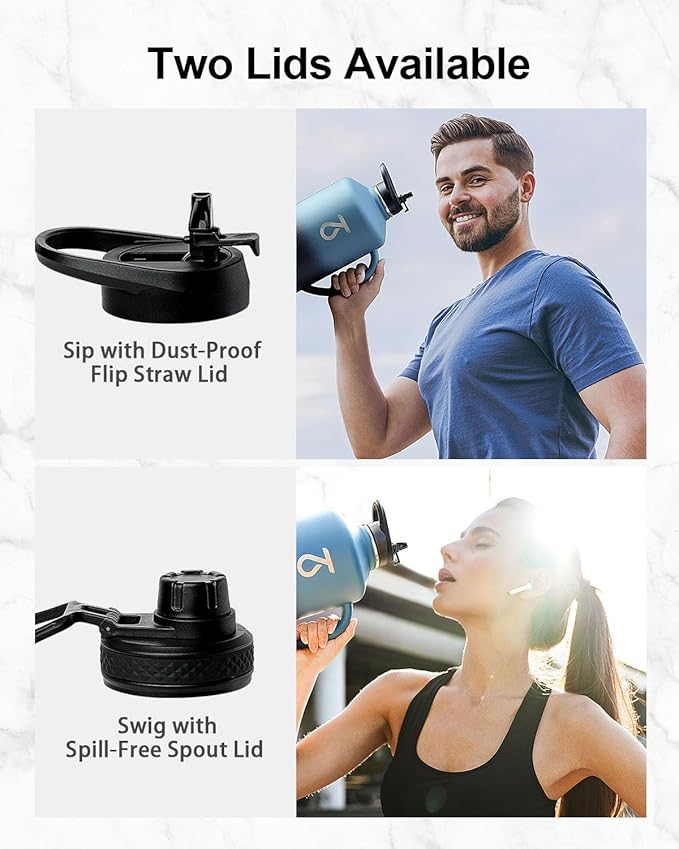 - A Handle You Can Rely On: Engineered with an integrated and ergonomic handle, Trebo 64 oz insulated water bottle is super sturdy and durable. The handle is thickened and hollowed for comfortable grip and easy lifting, so you can take it wherever you go. No Spills, No Worries: Our stainless steel water bottle comes with a dust-proof flip straw lid and a spill-free spout lid, meeting your different needs. With accurate silicone seal rings, they are both 100% leak-proof and spill-proof.