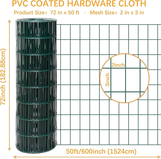- 【Size & Material】:Measures 72 inch(H) x 50 ft(L).Mesh size 2"x3".KICARI welded wire garden fence is made of heavy duty galvanized wire and coated with green vinyl.It is 14GA after coating vinyl,16GA before coating vinyl.