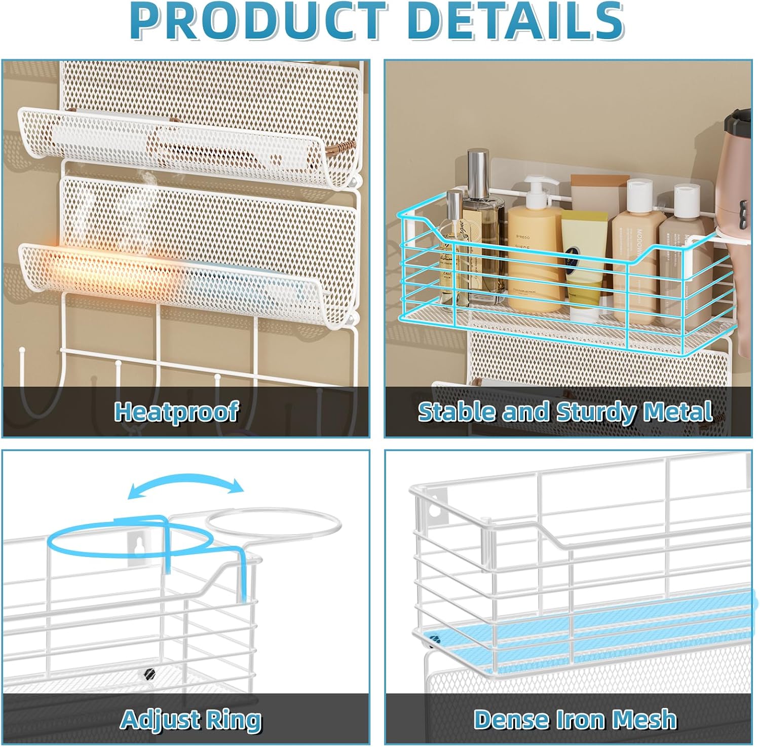 - 【1 Basket/3 tier Shelf】The hair tool organizer includes 1 metal basket, 2 mesh holders, 1 hairdryer holder, and 1-row hook. Separate all your hair tools, such as curling iron, blow dryer, straightener, etc.