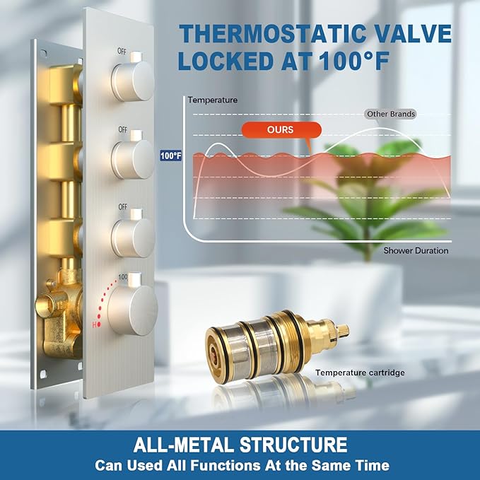 - 【Thermostatic Dual Shower System】Dual shower head system equipped brass thermostatic cartridge. The safety button that quickly keeps the water temperature at a constant 38°C/100.4℉. It is easy to use without the need for each adjustment. It can save you from scalding caused by sudden change of hot or cold water pressure