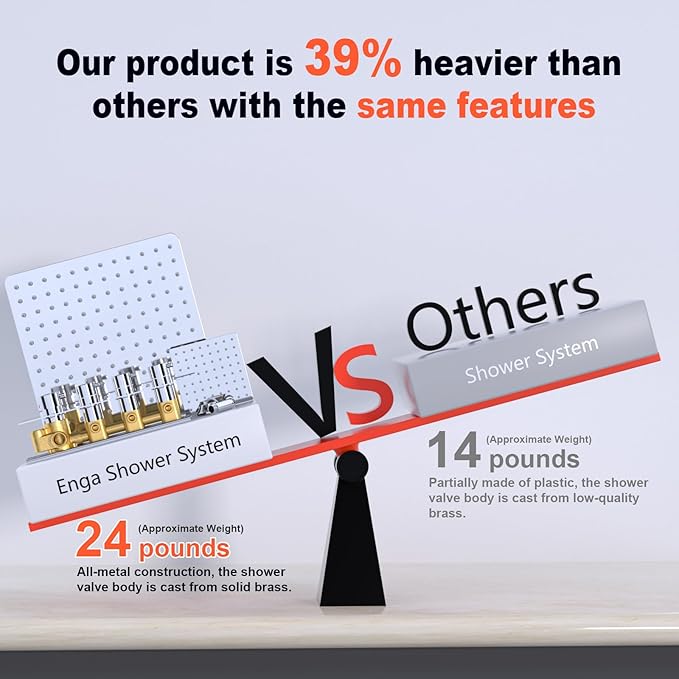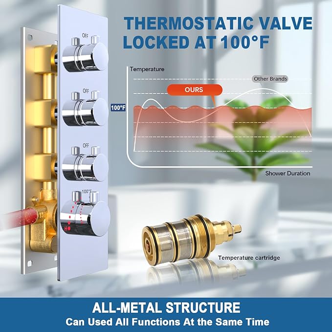 - 【Thermostatic Dual Shower System】Dual shower head system equipped brass thermostatic cartridge. The safety button that quickly keeps the water temperature at a constant 38°C/100.4℉. It is easy to use without the need for each adjustment. It can save you from scalding caused by sudden change of hot or cold water pressure