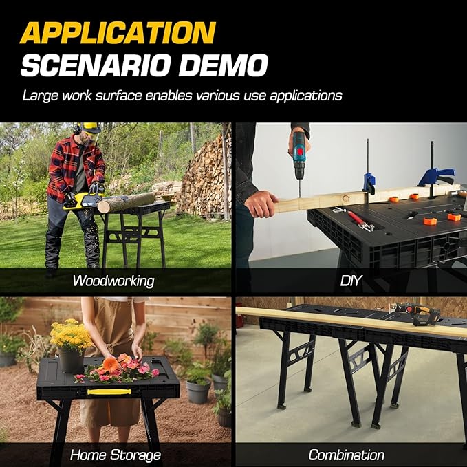 - Compact and Portable Design: Designed for your on-the-go needs, Folding table work bench portable only weighs 23.3 lbs for stress-free transport. Whether it's for your garage, workshop, or outdoor projects, it fits easily in any space and accompanies you wherever your work takes you.
