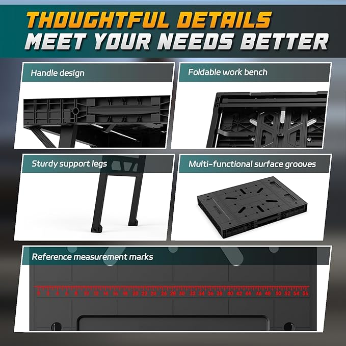 - Compact and Portable Design: Designed for your on-the-go needs, Folding table work bench portable only weighs 23.3 lbs for stress-free transport. Whether it's for your garage, workshop, or outdoor projects, it fits easily in any space and accompanies you wherever your work takes you.
