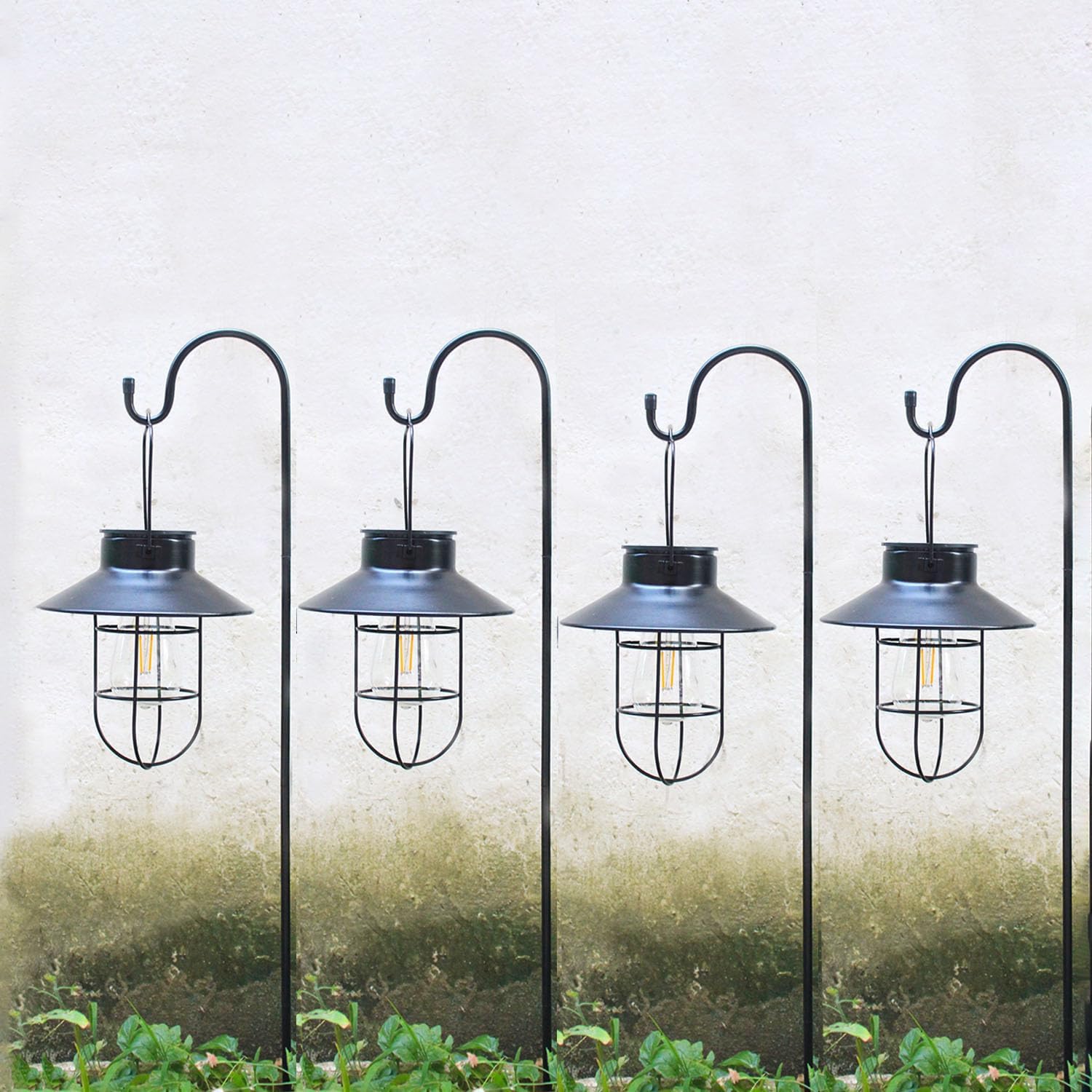 4 Pack Hanging Solar Lantern Lights with Shepherd Hook, Metal Waterproof Warm White Edison Bulb Lights for Garden Outdoor Pathway