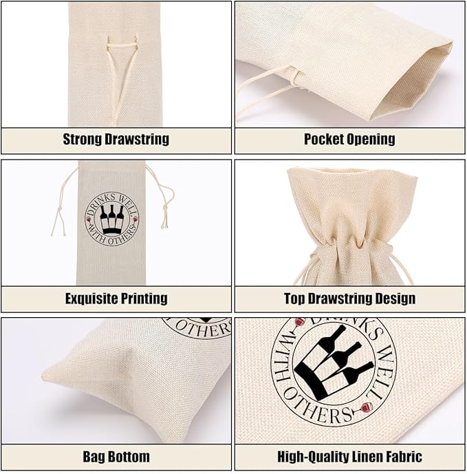 - Premium Material: Our wine gift bag is made of high-quality linen fabric, which is durable and reusable, reducing the impact on the environment. Good quality, strong support and safe enough to protect and hold wine or champagne. There is a drawstring design at the opening for easy opening.
