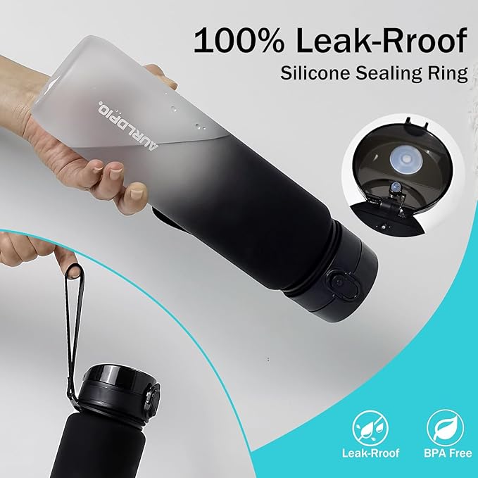 - 【HIGH-QUALITY DESIGN】 The Aurldpio drinking bottle is ergonomically shaped and features a durable hand strap and a special, reflective, frosted housing. It is 360° leak-proof, robust, durable and shock-resistant, making it easy to transport. The flip top lid also has a safety lock that prevents accidental opening. Use the additional cleaning brush to quickly clean your water bottle.