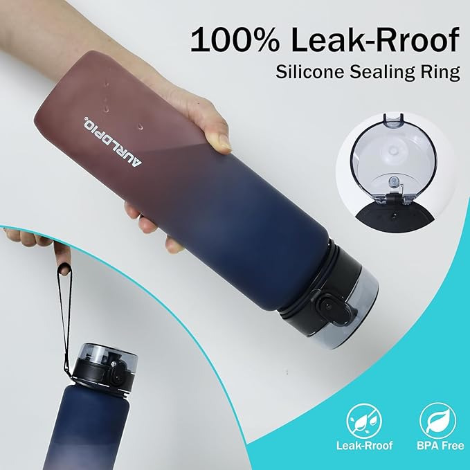 - 【HIGH-QUALITY DESIGN】 The Aurldpio drinking bottle is ergonomically shaped and features a durable hand strap and a special, reflective, frosted housing. It is 360° leak-proof, robust, durable and shock-resistant, making it easy to transport. The flip top lid also has a safety lock that prevents accidental opening. Use the additional cleaning brush to quickly clean your water bottle.
