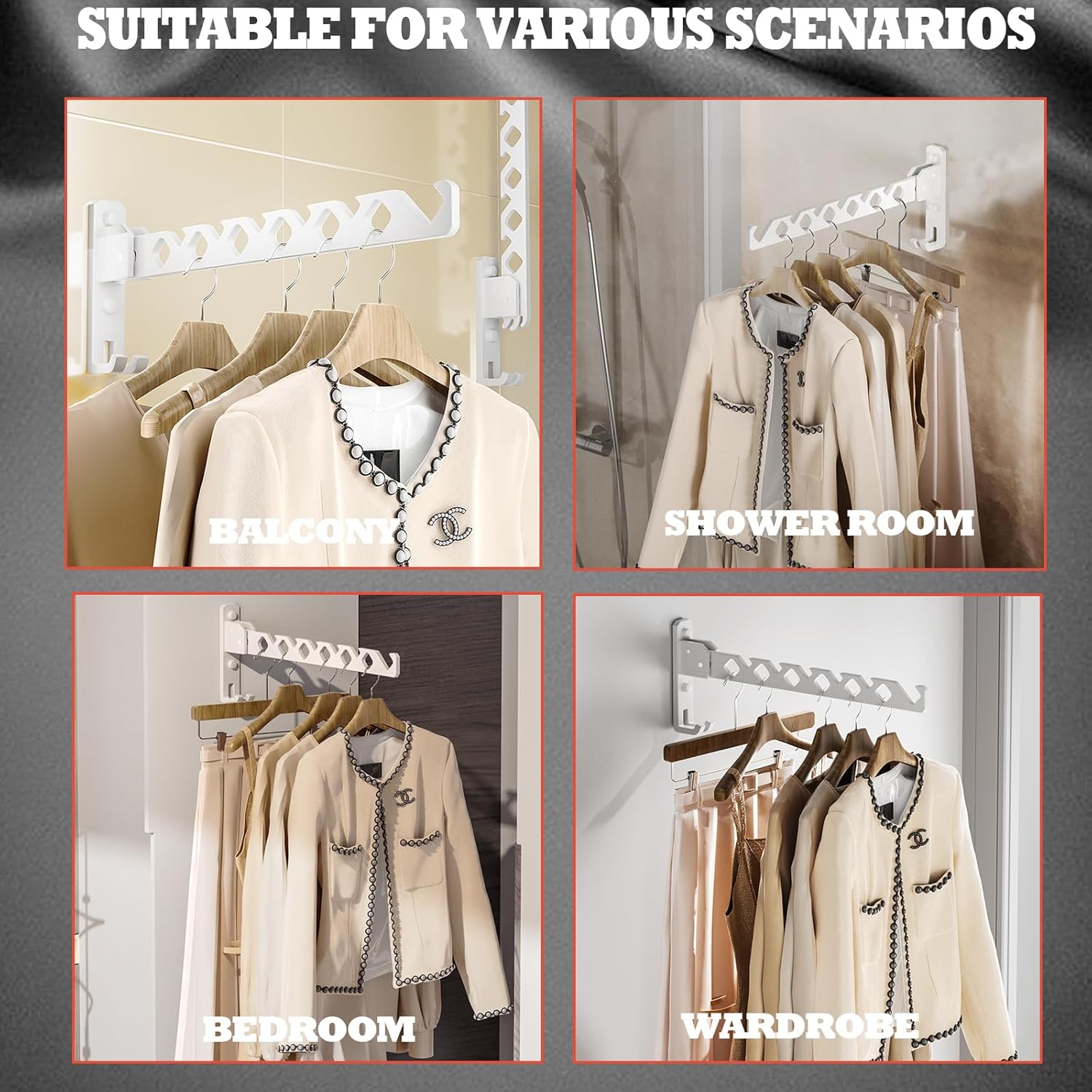 Wall Mount Coat Hanger Holder White Clothes Drying Organizer Rack Garment Hooks Aluminium Retractable Folding Indoor Wall Mounted Hanger Space Saver for Laundry Room Bedroom White 2 Pack with 8 Hooks