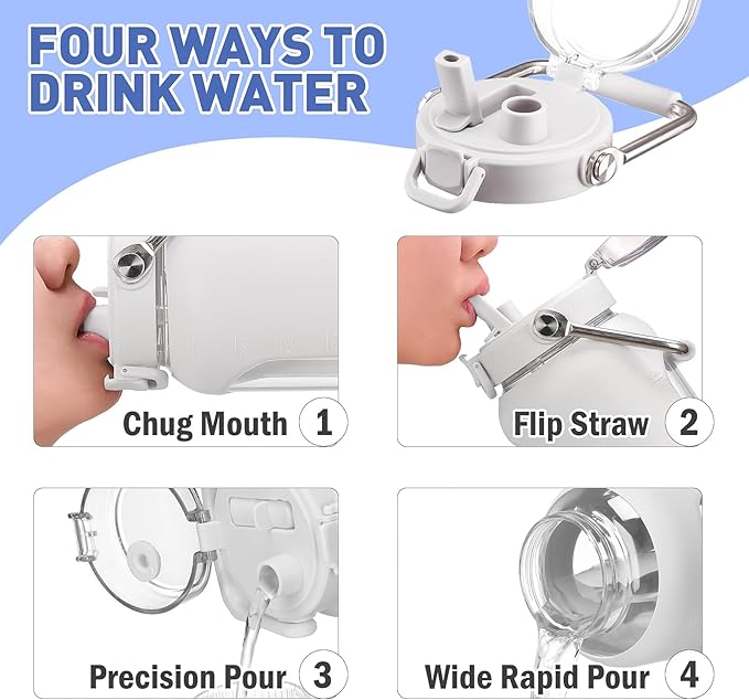 - INNOVATIVE DUAL-PURPOSE LID -The straw lid of 84oz glass water bottle offers two ways to drink. Whether you prefer sipping through a Flip Straw or chug from the Spout Mouth, the unique 2-In-1 Lid got you covered. The Leakproof lid also features a One-click Snap Lock and Dust-proof Cap for cleaner and more Hygienic drinking experience. One-handed operation-Push up to lock, Push down to unlock.