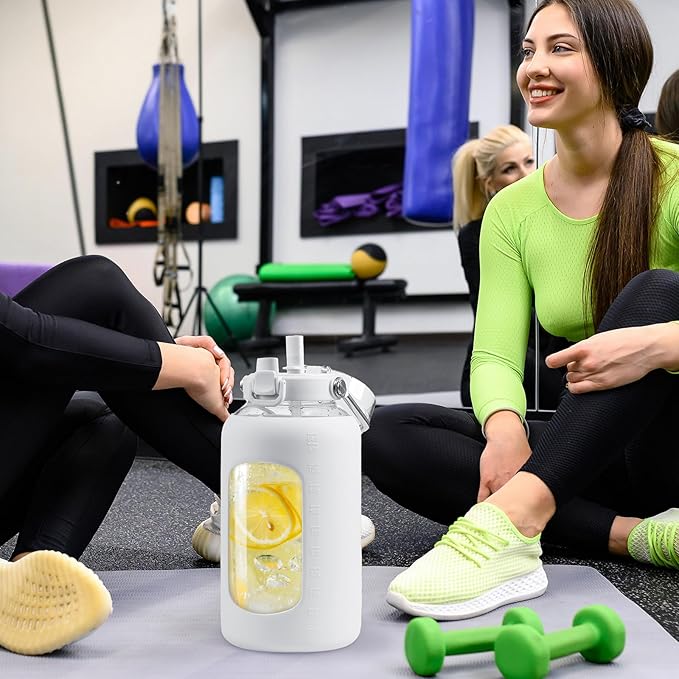 84oz Glass Water Bottle with Stainless Steel Handle,2.5L Gallon Water Bottle With 2-IN-1 Straw Lid, Silicone Sleeve and Motivational Capacity Marker, Wide Mouth Water Jug For Gym, Workout, White