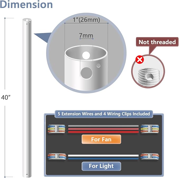 40" Ceiling Fan Downrod, 【1 Outside Diameter】 Matte White Extended Downrod, including 4 Wire Connectors and 5 Extension Wires (No Threads)