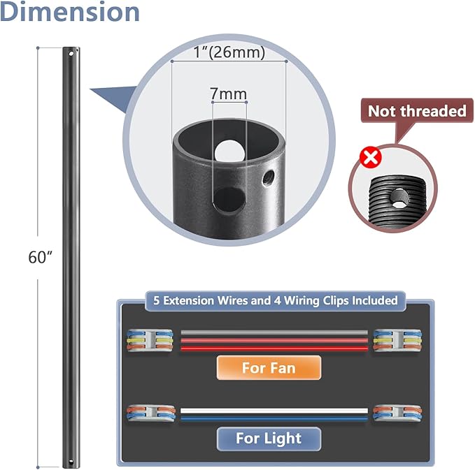 60" Ceiling Fan Downrod, 【1 Outside Diameter】 Black Extended Downrod, including 4 Wire Connectors and 5 Extension Wires (No Threads)