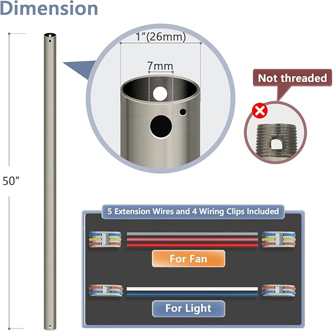 50" Ceiling Fan Downrod, 【1 Outside Diameter】 Brushed Nickel Extended Downrod, including 4 Wire Connectors and 5 Extension Wires (No Threads)