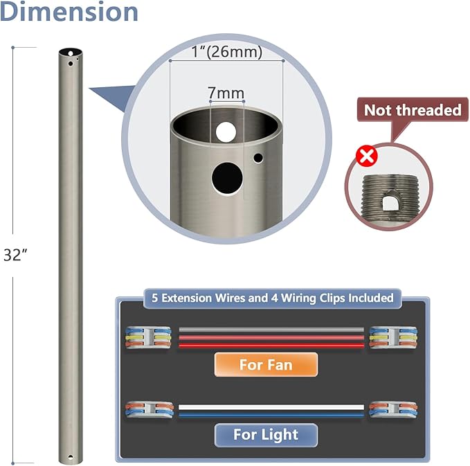 - 【Ceiling Fan Downrod Dimensions】Length: 32 inches, Outer diameter: 1 inch (26 millimeters), suitable for ceilings up to 9 feet high, ensuring both aesthetics and maximum airflow. (Extension rod length can be cut on-site)