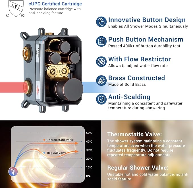 - 【Thermostatic Pressure Balance Valve】Precise thermostatic control eliminates the need for frequent temperature adjustments, ensuring water temperature stability at 38 degrees Celsius/100 degrees Fahrenheit. It effectively prevents scalding and temperature fluctuations caused by sudden water pressure drops, making it more user-friendly for the elderly and children.