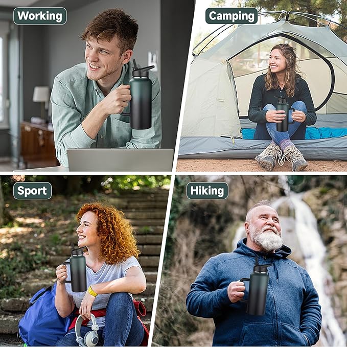 - 💦【Hot/Cold Insulated Water Bottle】This 32 oz water bottle stainless steel features advanced vacuum insulation technology, keeping hot drinks hot for 8 hours and cold drinks cold for 12 hours. Enjoy a chilled beverage after intense exercise or a hot coffee during winter camping. The wide mouth design allows for easy cleaning and ice cube filling.