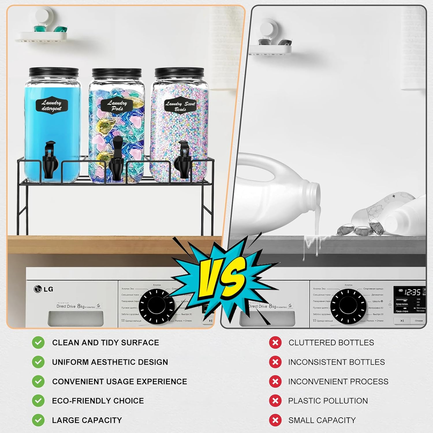 - 【Practicality and Safety】Featuring leak-proof, tightly sealed rubber rings, these glass laundry detergent dispensers prevent spills. The set includes drip mats to maintain a clean laundry area. An included wrench helps secure the spigots, and the instructions make this liquid laundry detergent dispenser user-friendly. Perfect for maintaining laundry jars organization and storage.