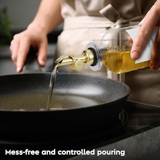 - Elegant & Aesthetically Pleasing — The minimalist and class design makes this small olive oil dispenser bottle the boost of elegance that your kitchen needs. Enjoy the modern feel of glass and gold plated stainless steel every time you cook.
