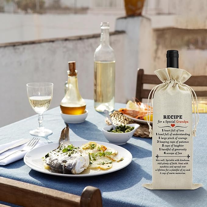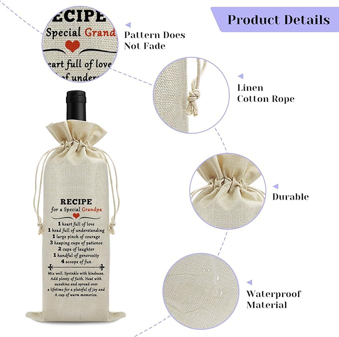 - Great Grandpa Gift:This wine bag is a unique and inspiring gift for great grandpa with the words "RECIPE for a Special Grandpa 1 heart full of love 1 head full of understanding 1 large pinch of courage 3 heaping cups of patience 2 cups of laughter 1 handful of generosity 4 scoops of fun Mix well. Sprinkle with kindness. Add plenty of faith. Heat with sunshine and spread over a lifetime for a plateful of joy and A cup of warm memories. give him a little surprise.