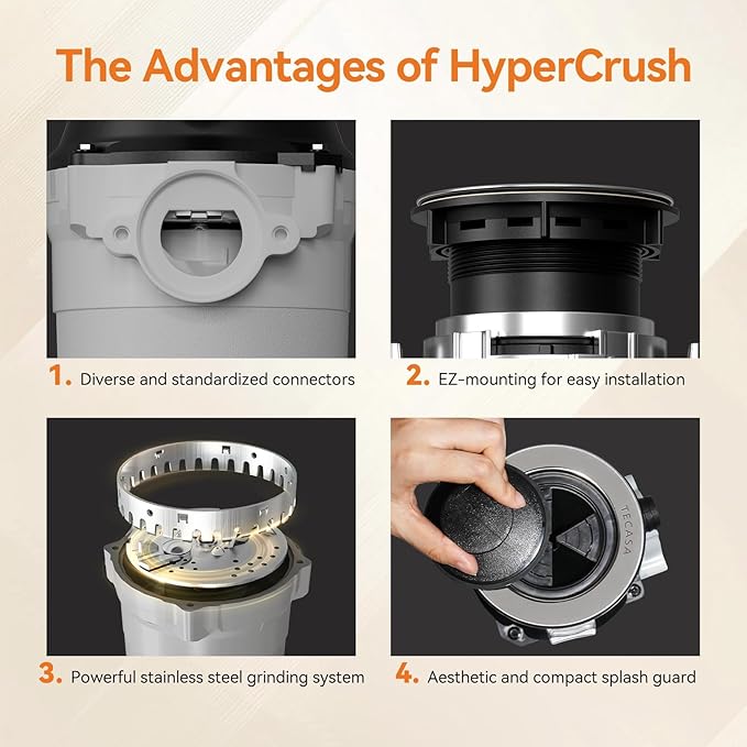 - ๐/๐ ๐๐: The TECASA 1/2 HP garbage disposal is ideal for most home kitchens, fitting standard 3-1/2 inch sink openings. It comes with a pre-installed 39" power cord for quick and easy electrical connection. The compact, space-saving design features a DC motor that delivers instant, enhanced torque for efficient grinding operations.