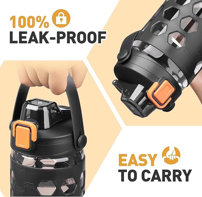 MUKOKO 32 oz Glass Tumbler with Straw,Glass Water Bottles with Time Marker,Iced Coffee Cup with 2 Lids-Handle Spout Lid&Straw Lid,Silicone Sleeve,Leakproof,1 Pack-Black
