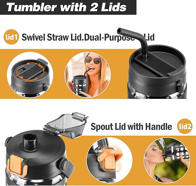 - TWO LID DESIGNS:Whether you prefer small sips or maximum thirst quenching.-Straw lid.Swivel lid with three positions: straw opening designed to prevent splashing and seals to hold reusable straws in place,beverage opening for straight sipping,full lid top for added leakage protection.-Leak-proof spout handle lid.The spout enables smooth liquid flow and the handle attached to the lid allows for easy carrying on the go.Suitable for gym and outdoors.
