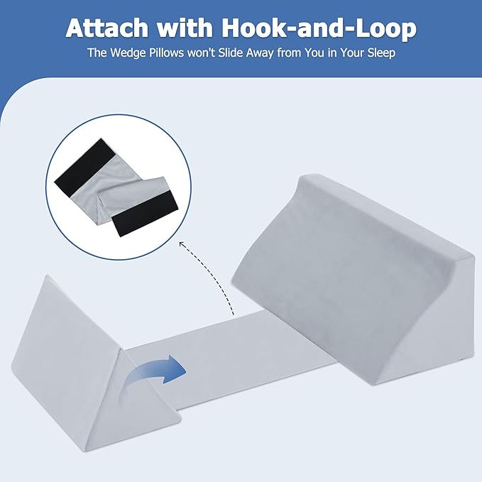 - 【Sturdy Back Pillow for Sleeping】: Two wedge pillows linked by a hook-and-loop and make sure that the wedge pillow won't slide away from you in your sleep. Assembly is a simple matter of affixing the two cushions in place via hook-and-loop fasteners using the third piece, which is a strip of fabric. The wedge pillow for side sleepers can be positioned really any way you want for maximum comfort.