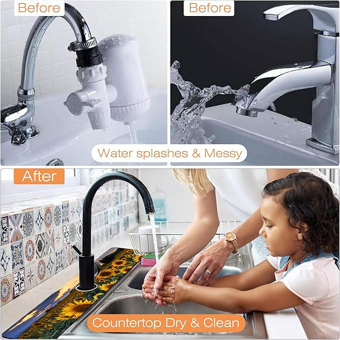 - 【Quick Drying】The faucet mat is easy to clean, gently scrub with a brush and detergent, then rinse with water, completely air-dry within an hour, and only takes a few minutes to clean with dishwashing liquid every two weeks. Saves the trouble of wiping the countertop every day.