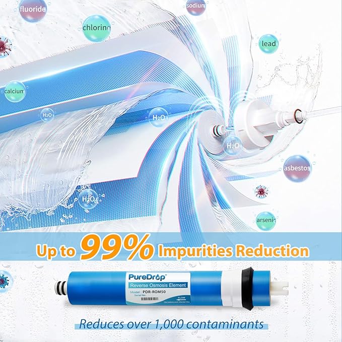 - High-quality RO Membrane: The 50 GPD RO membrane removes up to 99% of over 1,000 contaminants, including lead (removes up to 98% of lead), chlorine, fluoride, arsenic, asbestos, calcium, sodium, and more. With a 0.0001 micron pore size, it only allows water molecules to squeeze through and virtually nothing else.