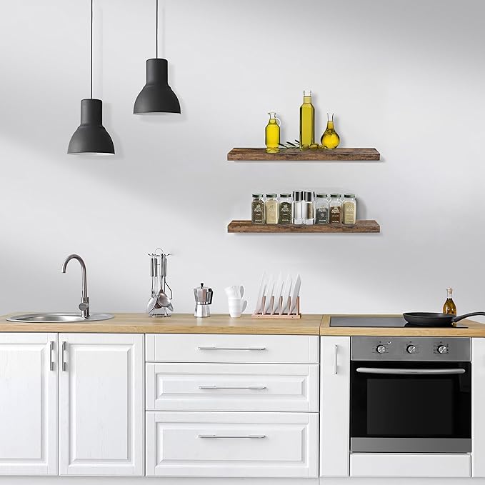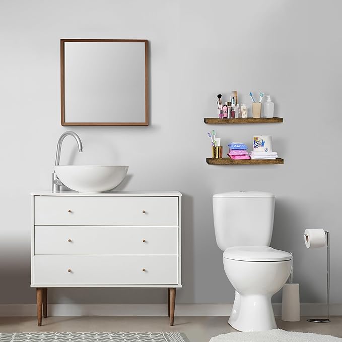 - Versatile & Functional Floating Wall Shelves: Install these floating shelves in the bedroom or bathroom to hold beauty/hair products - Place your wall shelf under a mirror in the entryway or exhibit family photos gallery style in a long hallway - Use as bathroom shelf, book shelf for wall, wall decor for bedroom, over the toilet shelf, kitchen floating shelves, floating nightstand, kitchen decor, living room wall decor, display shelf, and more