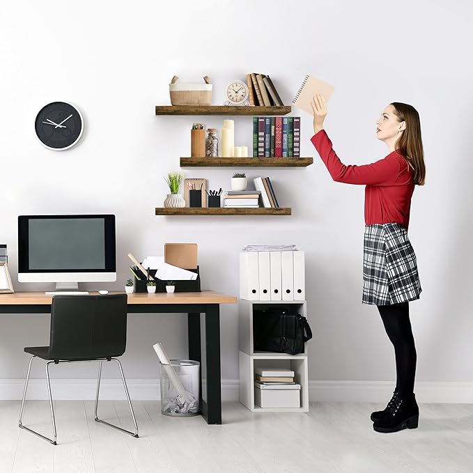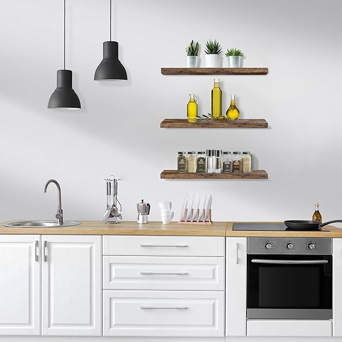 - Versatile & Functional Floating Wall Shelves: Install these floating shelves in the bedroom or bathroom to hold beauty/hair products - Place your wall shelf under a mirror in the entryway or exhibit family photos gallery style in a long hallway - Use as bathroom shelf, book shelf for wall, wall decor for bedroom, over the toilet shelf, kitchen floating shelves, floating nightstand, kitchen decor, living room wall decor, display shelf, and more