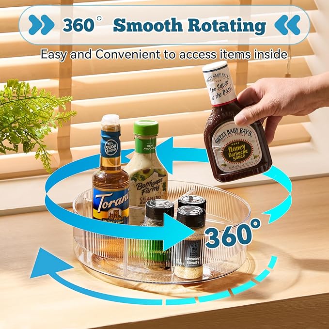 - 360° ROTATABLE EASY TO REACH: The Lazy Susan rotates 360 degrees smoothly and silently, eliminating the hassle of reaching into deep cabinets. The raised rim prevents items from sliding off while it spins, and the clear circular design with clear sides for easy viewing.