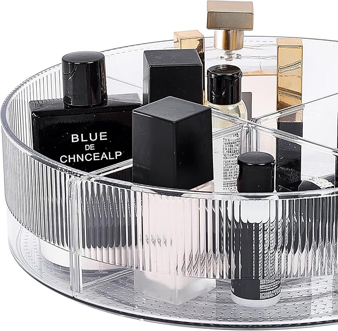 - MULTIPURPOSE ORGANIZER: This versatile Lazy Susan turntable is perfect for a variety of uses. Organize your spices, seasonings, snacks or even display items on a shelf. It also serves as a stylish cosmetics, perfumes holder or a bathroom organizer, keeping your desktop neat and tidy. The upgraded divider design makes it easier for you to separate and organize different items.