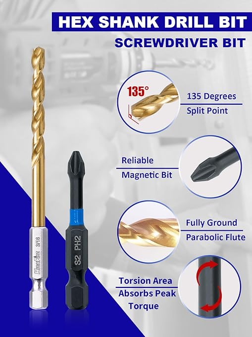 - Durable and High Quality: Crafted from high-speed steel with titanium coating for drill bits and stainless steel plus impact-resistant S2 materials for screwdriver bits, this impact drill bit set is engineered to withstand high-intensity torque output, ensuring long-lasting performance.