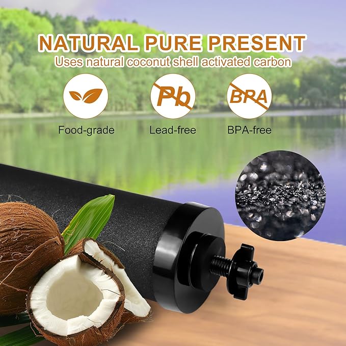 - High-efficiency filtration: The black water filter for Berkey water filter replacements, with the same strong purification capacity as the original filter, can reduce up to 99% of chlorine. It also can reduce heavy metal, sediment, chlorine, sand, rust, odor, and large particles in source water, improving the taste of water. allows you to enjoy clean and healthy water at all times.