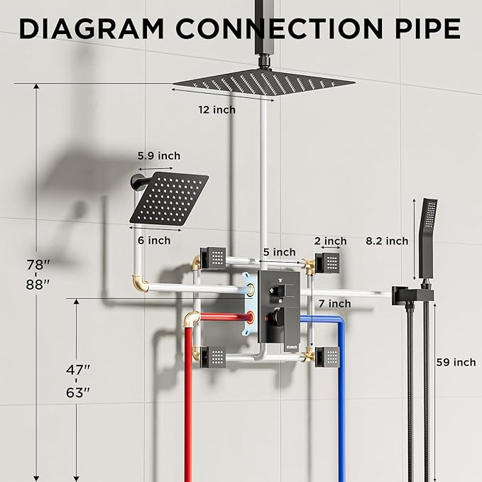 - Enjoy the shower time with your Lover:Our multi head shower system includes a 12-inch and 6-inch rain showerhead, along with a water-saving handheld spray, the large shower spray help you showering no more freezing in the corners and no more perilous side-switching.Users have the ability to activate three modes and utilize dual showerheads, including a handheld spray, according to their preferred showering preferences. This innovative feature offers a completely new showering experience