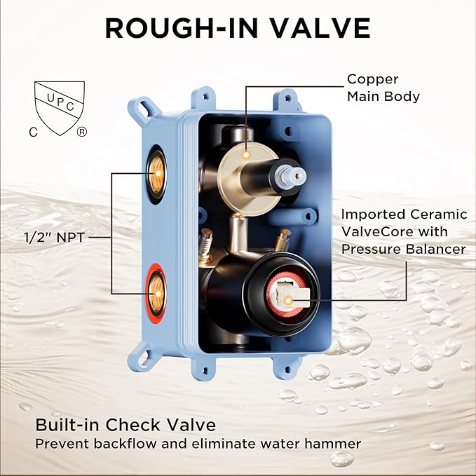 - Easy adjustment and smooth operation: 4 functions shower valve control is clearly labeled for effortless identification.You can turn the knob to switch to rain shower and handheld spray. It smoothly adjusts water pressure and allows the volume or flow of water to be changed independently through the single handle lever. The built - in check valves of the shower valve constantly monitor water pressure balance, shielding you from scalds due to sudden hot or cold water pressure changes.