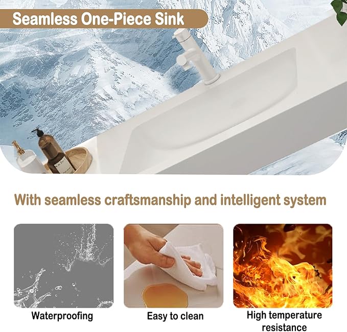 - Seamless Integrated Basin: The seamless integrated basin design of this blue bathroom vanity achieves a perfect connection between the countertop and the basin. It is not only more aesthetically pleasing visually but also more convenient for cleaning. The seamless design avoids dirt accumulation at the joints and reduces the difficulty of cleaning. At the same time, the surface treatment process of the integrated basin ensures no water marks when flushing, with no hygiene dead corners and easy maintenance. This design not only enhances the beauty of the vanity but also improves its practicality and durability.
