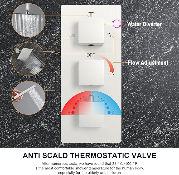 - 【Thermostatic Shower System】Dual shower shower head system equipped with a cUPC certified thermostatic valve. The safety button that quickly keeps the water temperature at a constant 38°C/100.4℉. It is easy to use without the need for each adjustment. It can save you from scalding caused by sudden change of hot or cold water pressure.