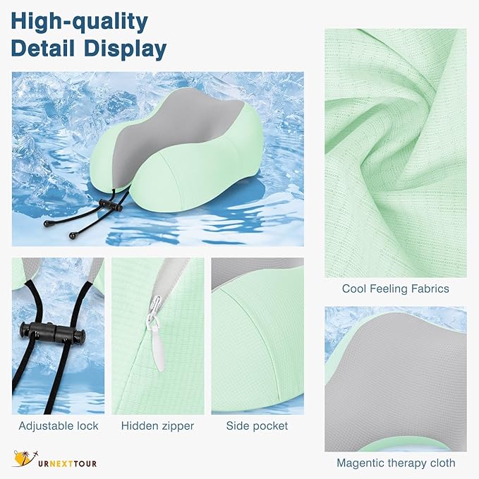 - Premium Memory Foam & Washable Cover: Urnexttour travel neck pillows for airplanes were made of superior-quality, high-density memory foam filler with 3s rebound technology. This flight pillow is covered with a comfortable and breathable magnetic therapy cloth and supper soft velour fabric; millions of tiny microbeads inside give you a very smooth feeling on your face. The cooling pillowcase has an invisible zipper that can easily be removed for washing.