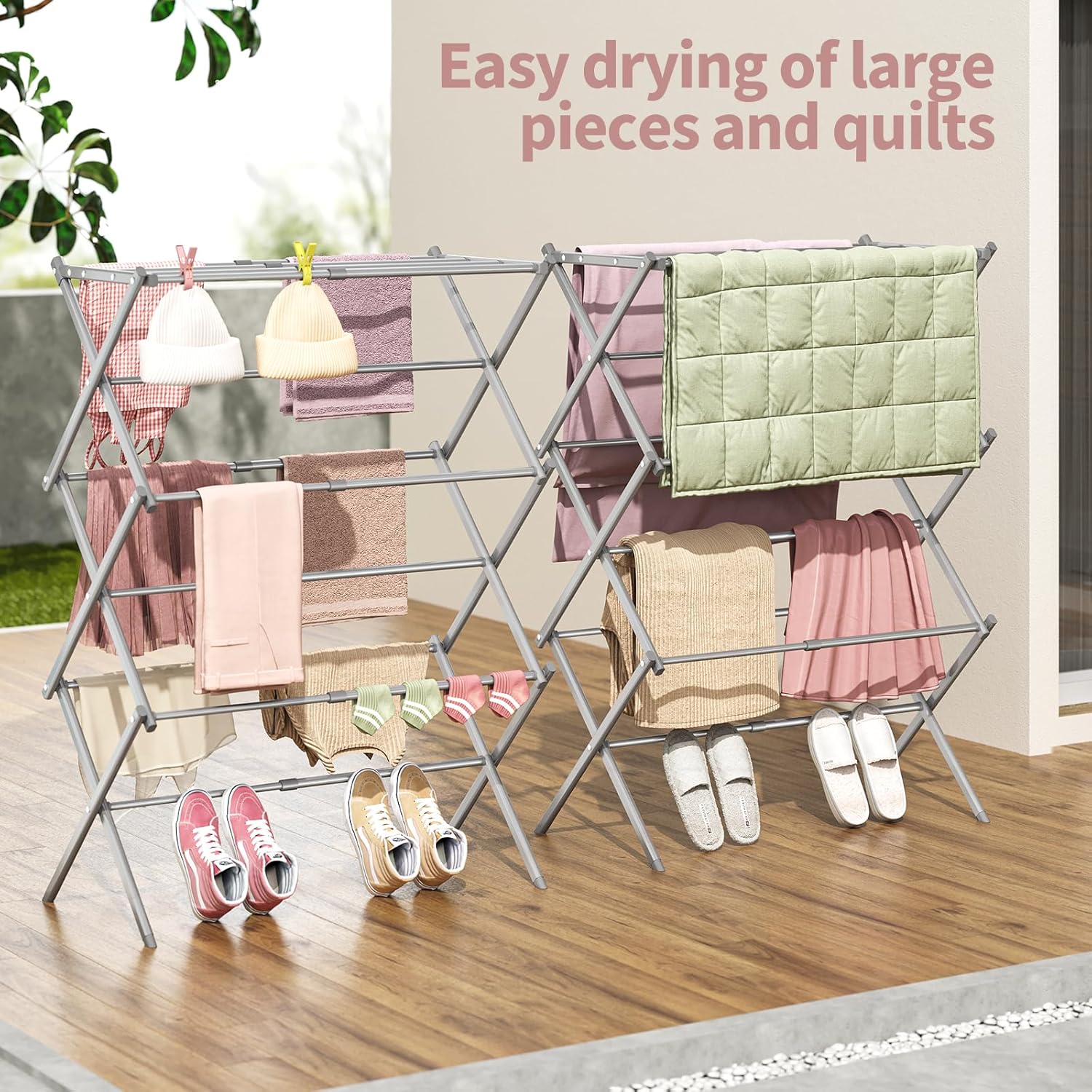 - Material: The clothes drying rack is made of metal and has a rust-resistant coating, which can endure different weathers for indoor and outdoor use, making it perfect for apartments or small spaces.