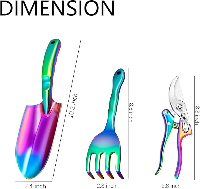 - Vibrant Rainbow Colors: This gardening tool set features a striking rainbow-colored finish that adds a vibrant touch to your gardening tasks.