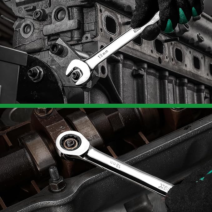 - The 12 Point ratcheting wrench set includes: SAE 1/4 ", 5/16 ", 3/8 ", 7/16 ", 1/2 ", 9/16 ", 5/8 ", 11/16 ", 3/4 ", 13/16 ", 7/8 ", 15/16 ", 1 ", and Metric 8 mm, 9 mm, 10 mm, 11 mm, 12 mm, 13 mm, 14 mm, 15 mm, 16 mm, 17 mm, 18 mm, 19 mm, with visible size for easy identification