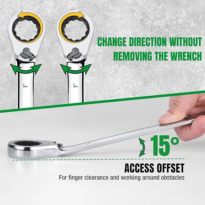 - The 72-tooth ratchet gear needs only a 5-degree working swing arc to engage fasteners quickly, and the 15-degree offset creates clearance for hands or obstacles in tight spaces, making it ideal for use in confined spaces